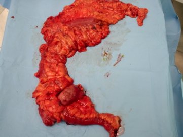 zavzat. Proximální konec infiltrace zasahuje až k hlavě pankreatu. Resekce céka, vzestupného tračníku a asi 20 cm terminálního ilea. Anastomóza ileotransverzální end to