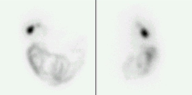(obr. č. 6), za dalších 30 minut (ve 120. minutě) statická scintigrafie v přední a pravé boční projekci