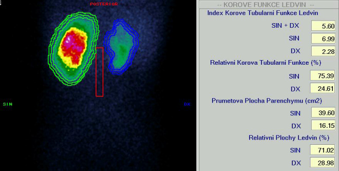 Za 2 hodiny po i.v. aplikaci 111 MBq 99mTc-DMSA se zobrazily obě ledviny, které jsou obvyklé lokalizace. Levá ledvina je obvyklého tvaru a v dlouhé ose měří 72 mm. Pravá ledvina je menší, v dlouhé ose měří 60 mm. Kresba parenchymu levé ledviny je homogenní. Kresba parenchymu pravé ledviny je difúzně a drobnoložiskově nehomogenní. Index korové tubulání funkce je sin + dx 5,64 (sin 7,05, dx 2,28). Relativní korová tubulární funkce levé ledviny 75,58 %, pravé 24,42 %. Závěr: 1. Menší pravá ledvina s difúzním a drobnoložiskovým poškozením parenchymu, svráštělá ledvina. Nález je kompatibilní s dg. Refluxní