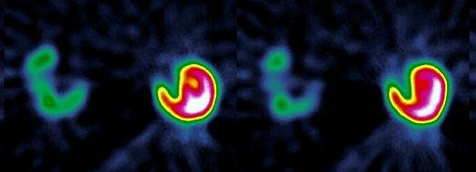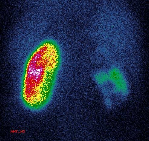 99mTc-DMSA s cílem posoudit relativní funkci hydronefroticky změněné pravé ledviny. Byl proveden statický scintigram obou ledvin z přední a zadní projekce, oba scintigramy na 500 000 impulzů. Pro zvýšení senzitivity, specificity a upřesnění prostorové lokalizace následoval SPECT (3°/20 sekund, 128 x 128 matrice). Aplikovaná aktivita činila 200 MBq i.v. Vyšetření zjistilo významnou redukci parenchymu pravé ledviny. Relativní korová tubulární funkce pravé ledviny byla 14 %. Levá ledvina měla normální nález. Závěr vyšetření zněl – významná redukce parenchymu pravé ledviny. Vzhledem k tomu, že pacientka neměla obtíže, ani pyelonefritidu a ani hypertenzi, urolog se rozhodl pouze pro další sledování pacientky prozatím bez nutnosti nefrektomie.