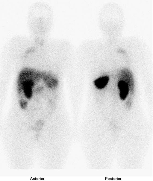 111In (přípravek OctreoScan firmy Mallinckrodt Medical) na dvouhlavé tomografické kameře Symbia T2 firmy Siemens (bohužel pro poruchu CT nebylo možno provést CT vyšetření s fúzí SPECT/CT). Je patrná fyziologická depozice radioaktivity ve slezině, pravé ledvině, močovém měchýři, střevech a difuzně v játrech a patolog. ložisko zvýšené depozice radiofarmaka v horní části pravé plíce.