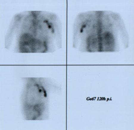 K verifikaci indikováno vyšetření pomocí Galium - 67.