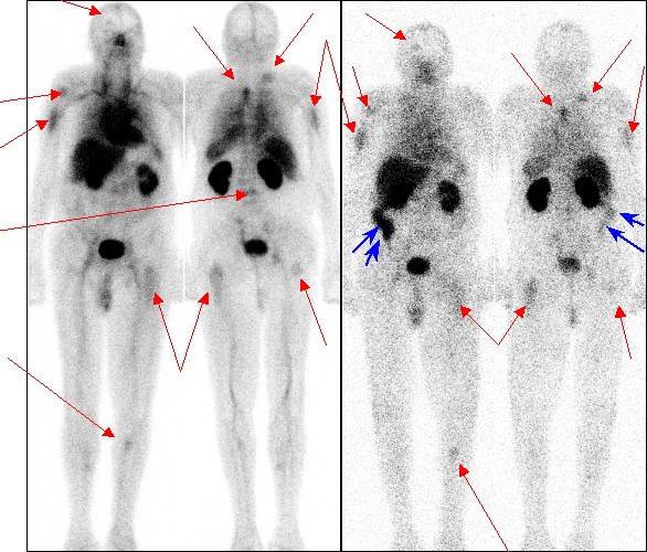 Mnohočetné, CEA produkující metastázy (červené šipky) ve skeletu, patrné již při scintigrafii skeletu