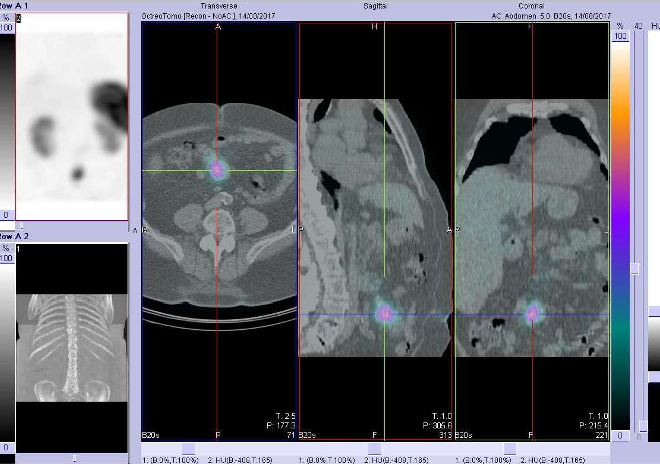(přípravek OctreoScan firmy Mallinckrodt Medical) a provedli pomocí hybridní tomografické scintilační kamery Symbia T2 firmy Siemens opatřené kolimátory pro střední energie planární celotělovou scintigrafii a cílenou tomografickou scintigrafii (SPECT) břicha a pánve kombinovanou s CT za 4 a 24 hod.