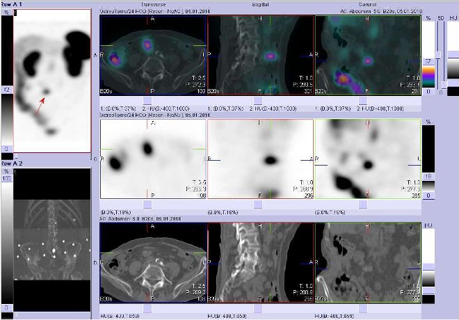 (přípravek OctreoScan firmy Mallinckrodt Medical). Pomocí dvoudetektorové hybridní tomografické kamery Intevo (SPECT/CT) firmy Siemens opatřené kolimátory pro střední energie jsme provedli planární celotělovou scintigrafii za 4 a za 24 hod., navíc cílenou tomografickou scintigrafii (SPECT) břicha a pánve kombinovanou s CT za 4 a 24